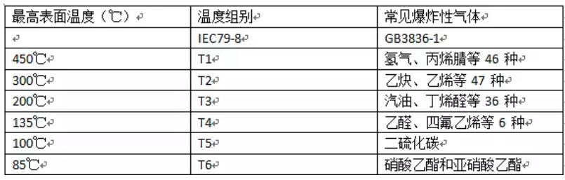 這是與氣體點(diǎn)燃溫度有關(guān)的電氣設(shè)備(假定環(huán)境溫度為40℃時(shí))的最高表面溫度,點(diǎn)燃能量與點(diǎn)燃溫度無(wú)關(guān)。在標(biāo)準(zhǔn)BS5345第一部分中列出了所有可燃性氣體和其組別。